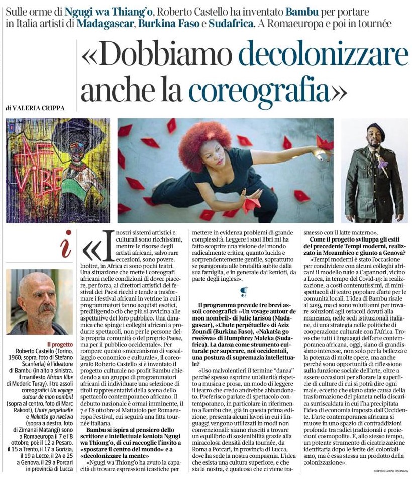 Su La Lettura de Il Corriere Della Sera, l’intervista di Valeria Crippa a Roberto Castello sul progetto BAMBU, che debutta a Romaeuropa Festival il 7 e 8 ottobre.